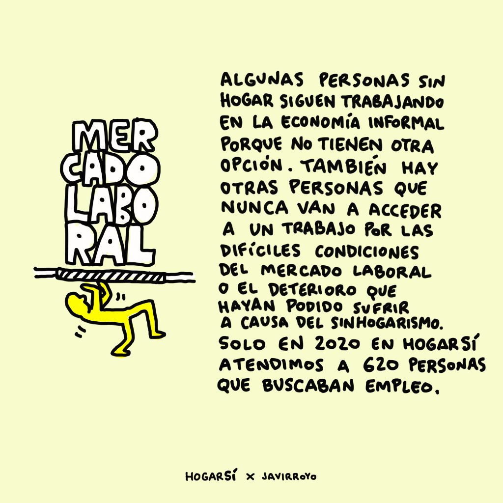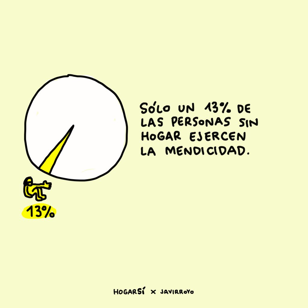 Ante la creencia de que las personas en situación de sinhogarismo no quieren trabajar y que sólo se dedican a la mendicidad, tenemos datos que nos dicen que, en realidad, sólo el 13% de ellas se dedica a esa actividad. Otras personas trabajan, muchas veces en la economía informal porque no tienen otra opción o en empleos con salarios muy bajos. Además, la mitad de las personas en situación de sinhogarismo que no trabaja está en búsqueda de empleo, en HOGAR SÍ, ¡sólo en el último año hemos atendido a 621 personas en situación de sinhogarismo que buscaba empleo!. Por último, hay personas que nunca van a acceder a un trabajo por las difíciles condiciones del mercado laboral o por el deterioro que han podido sufrir en la calle.