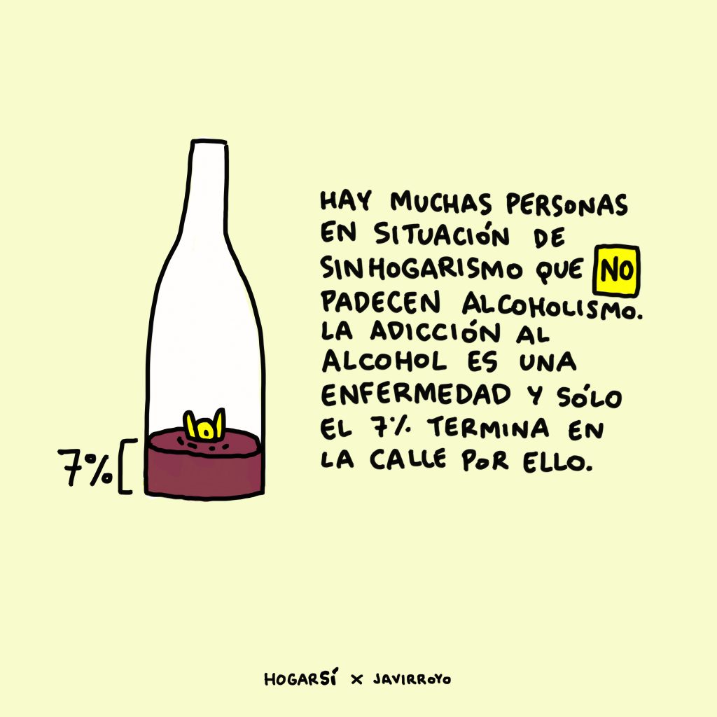 Si te dicen que las personas terminan en la calle por culpa del consumo del alcohol, ¡los datos también nos muestran que es falso! Hay muchas personas en situación de sinhogarismo que no beben alcohol y sólo en un 7% de los casos es la causa de terminar en la calle. Además, también hay muchas personas que sufren esta enfermedad y que tienen un hogar.