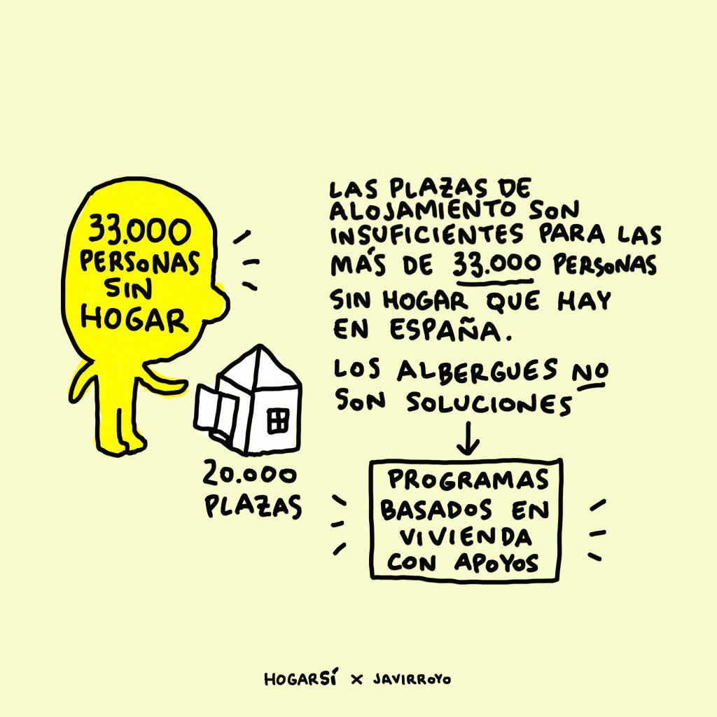 Otra falsa creencia muy extendida es que las personas viven en la calle porque quieren, porque les gusta la libertad, sino irían a los albergues disponibles. Sin embargo, la realidad que no hay plazas suficientes en los alojamientos disponibles para las más de 33.000 personas en situación de sinhogarismo en España. Además, los albergues no son una solución, ya que es imposible rehacer tu proyecto de vida en este tipo de alojamiento (participar en la vida del barrio, invitar a amigos y familia, buscar empleo, descansar bien, …) por eso en HOGAR SÍ apostamos por soluciones de vivienda con apoyos.