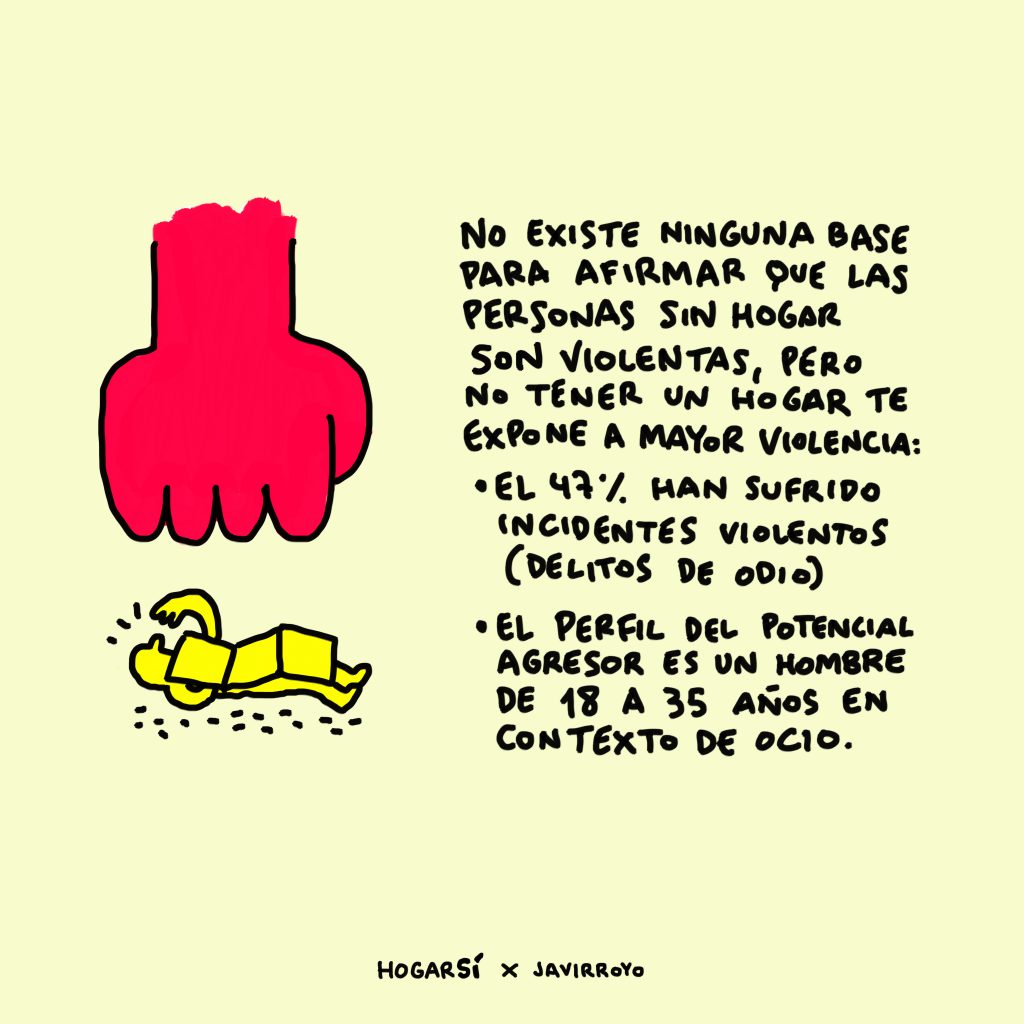 También estarás esperando escuchar que las personas en situación de sinhogarismo son violentas.  No hay datos para afirmar esto, sin embargo, sí que los hay para afirmar que no tener hogar expone a las personas a sufrir mayor violencia, y son escalofriantes: casi la mitad de las personas en situación de sinhogarismo han sufrido incidentes o delitos de odio. La mayoría de los casos de la mano de jóvenes entre 18 y 35 años en contexto de ocio nocturno.