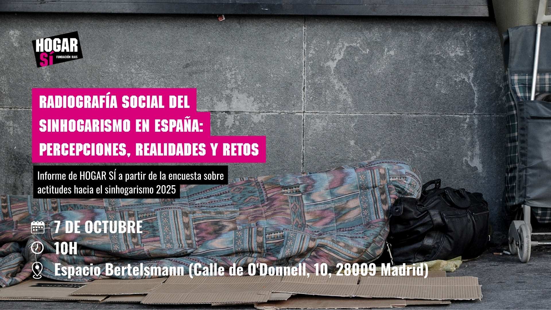 ¿Qué piensa la ciudadanía sobre el sinhogarismo en España?  El próximo 7 de octubre, de 10:00h a 13:30h, HOGAR SÍ presenta en el Espacio Bertelsmann (Madrid) el informe Radiografía social del sinhogarismo en España: percepciones, realidades y retos, elaborado por 40dB a partir de 1.500 entrevistas. El estudio analiza cómo se percibe el sinhogarismo en nuestro país, qué papel se atribuye a las administraciones públicas y qué...